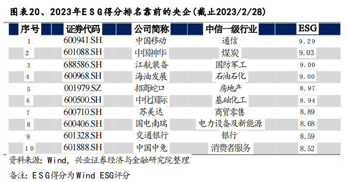 ESG得分居前的上市公司有中國(guó)移動(dòng)、中國(guó)神華、江航裝備、海油發(fā)展、招商蛇口、中化國(guó)際、蘇美達(dá)、國(guó)電南瑞、交通銀行、中國(guó)中免。