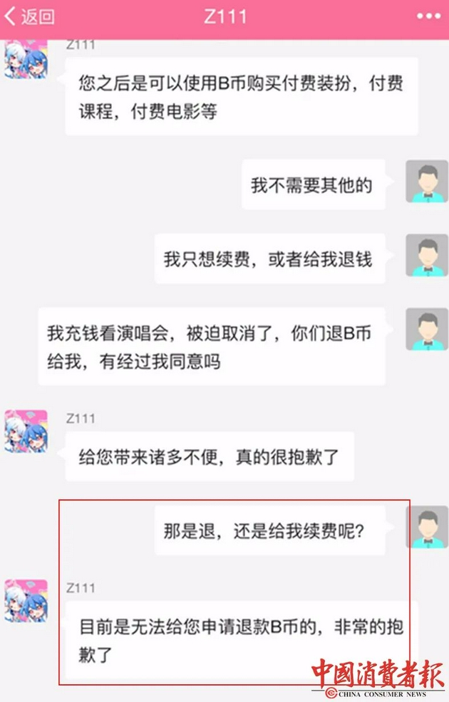 “去年12月11日,為了在嗶哩嗶哩(以下簡(jiǎn)稱B站)看一場(chǎng)演唱會(huì),用蘋果手機(jī)向B站平臺(tái)充值了251元購買門票,之后因?yàn)橐咔檠莩獣?huì)被取消,但我一直沒收到關(guān)于退費(fèi)的任何信息。” 今年9月9日,家住上海的劉先生向《中國(guó)消費(fèi)者報(bào)》說道。