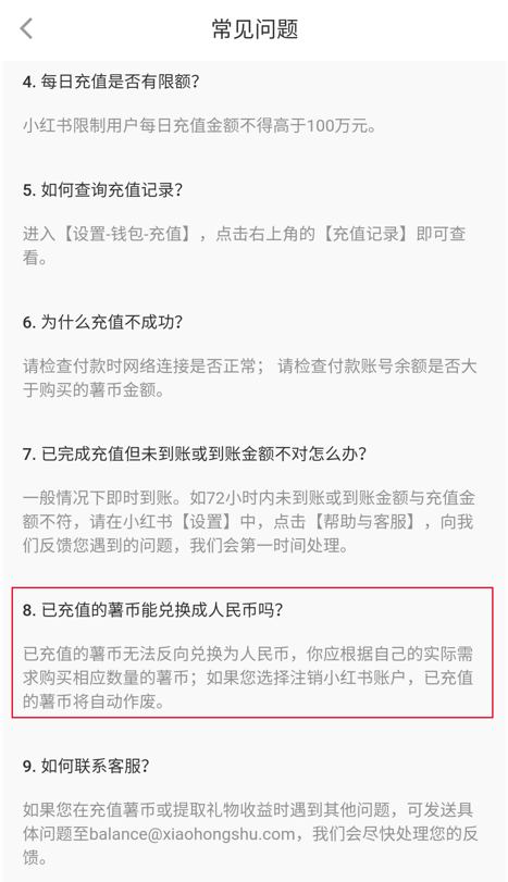 9月26日,《中國(guó)消費(fèi)者報(bào)》在小紅書APP的常見問題頁面查詢到:“已充值的薯幣無法反向兌換為人民幣,你應(yīng)根據(jù)自己的實(shí)際需求購買相應(yīng)數(shù)量的薯幣。”