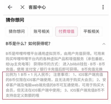 9月26日,《中國(guó)消費(fèi)者報(bào)》在B站APP的客服中心頁面查詢到:“B幣充值兌換比例為1B幣=1元人民幣,蘋果iOS客戶端充值的B幣僅限在iOS客戶端使用,且無法用于購買大會(huì)員。iOS客戶端充值B幣不支持自定義數(shù)額。”