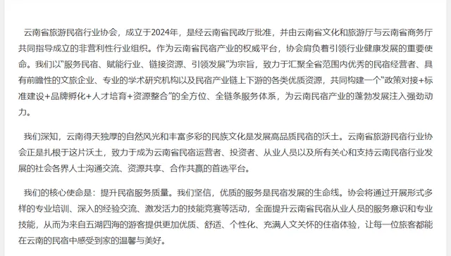 公開資料顯示,云南省旅游民宿行業(yè)協(xié)會,成立于2024年,是經(jīng)云南省民政廳批準,并由云南省文化和旅游廳與云南省商務(wù)廳共同指導成立的非營利性行業(yè)組織。