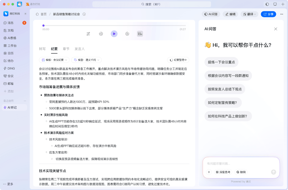 在學(xué)習(xí)、面試、項(xiàng)目溝通、銷售拜訪、咨詢時(shí),釘釘用戶都可以在AI聽(tīng)記的轉(zhuǎn)寫紀(jì)要詳情頁(yè)面,使用AI問(wèn)答功能,與AI協(xié)作完成具體的工作,實(shí)現(xiàn)效率提升,不再需要翻找原文。