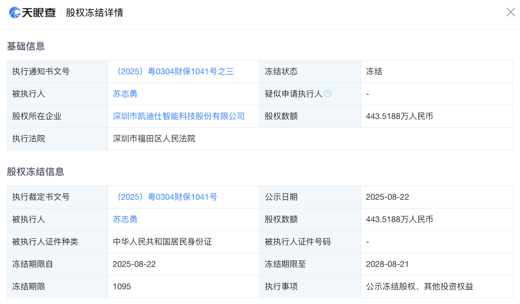 近日,知名智能門鎖品牌“凱迪仕”母公司深圳市凱迪仕智能科技股份有限公司(簡稱“深圳凱迪仕”)創始人蘇志勇、蘇祺云父子所持包括深圳凱迪仕在內的多家公司股份被地方法院凍結。
