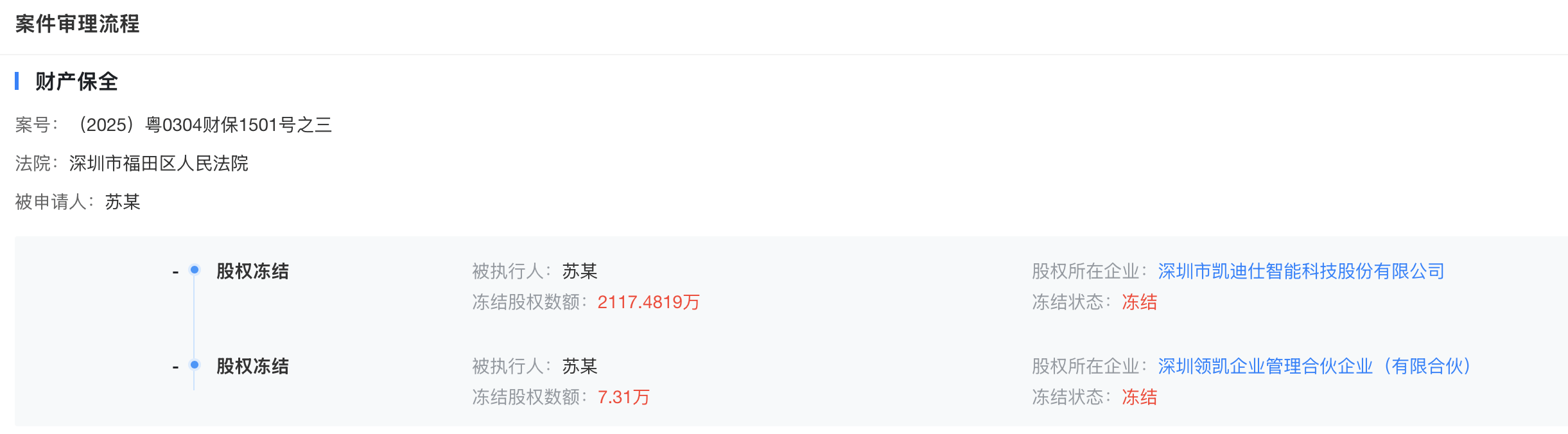 天眼查顯示,蘇祺云所持深圳凱迪仕2117.4819萬元人民幣股權、深圳領凱企業管理合伙企業(有限合伙)7.31萬元人民幣出資額,本月被深圳市福田區人民法院凍結。