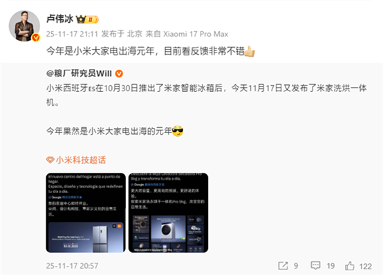 小米集團(tuán)合伙人、總裁盧偉冰發(fā)文表示:"今年是小米大家電出海元年,目前看反饋非常不錯(cuò)",這一表態(tài)與小米在8月份2025年第二季度財(cái)報(bào)電話會(huì)議上透露的信息一致,即2025年將是小米大家電國(guó)際化戰(zhàn)略的第一年。小米還設(shè)定了雄心勃勃的目標(biāo):到2030年,要成為大家電市場(chǎng)中的頭部品牌。
