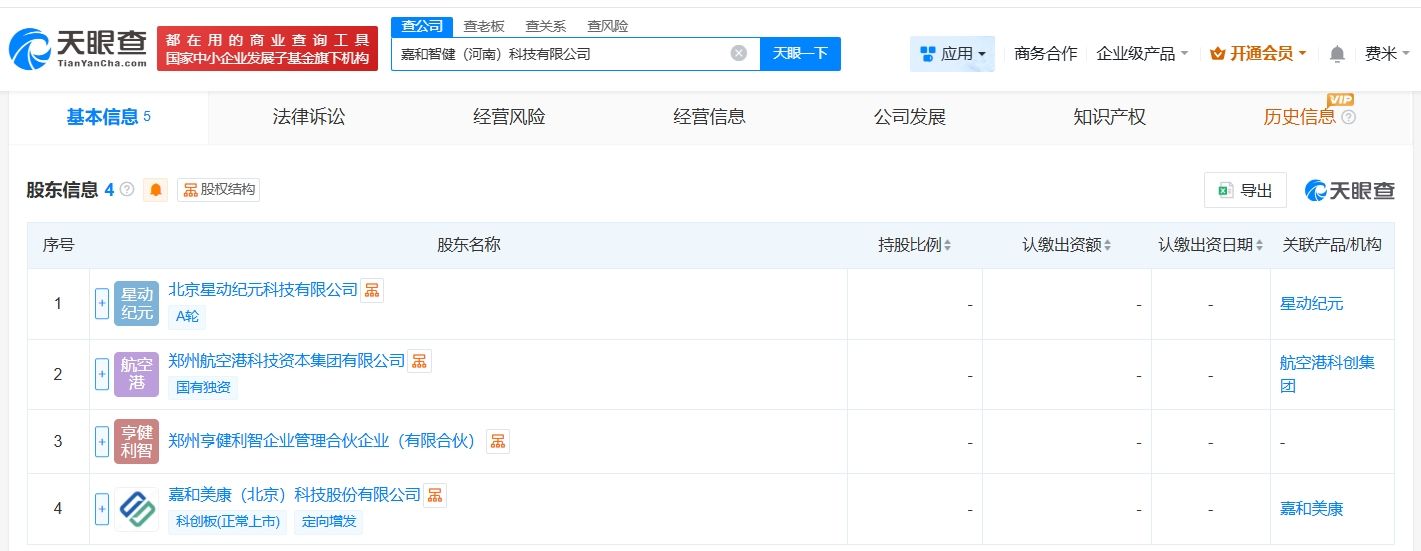 天眼查App顯示,近日,嘉和智健(河南)科技有限公司成立,法定代表人為邊衛斌,注冊資本1億人民幣,經營范圍包括智能機器人的研發、人工智能基礎軟件開發、人工智能理論與算法軟件開發等,由北京星動紀元科技有限公司、鄭州航空港科技資本集團有限公司、鄭州亨健利智企業管理合伙企業(有限合伙)、嘉和美康(688246)共同持股。