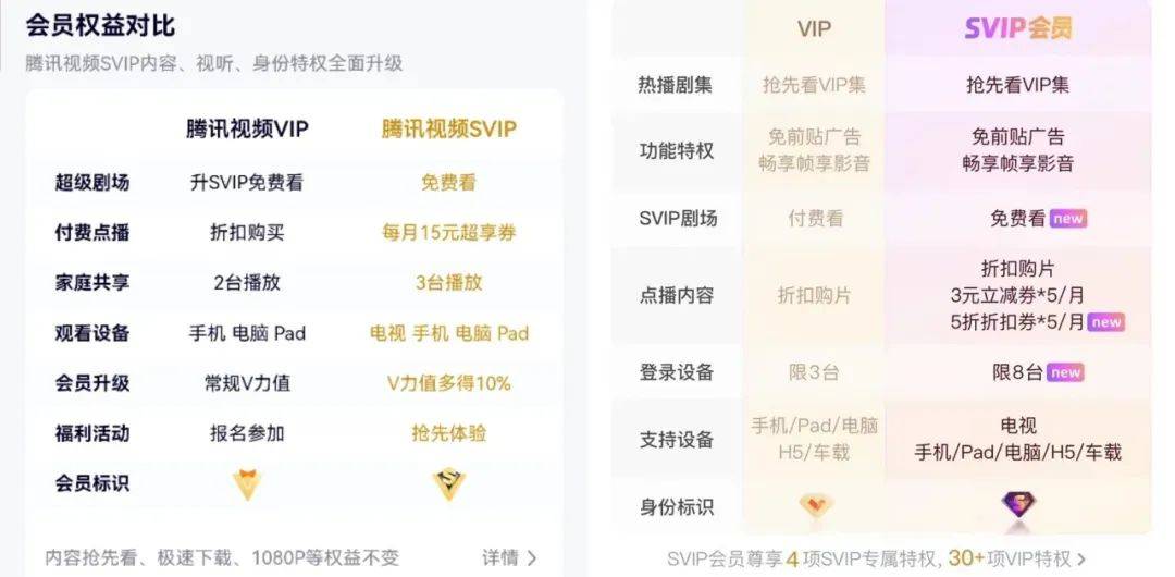 騰訊視頻(左)、優酷(右)的VIP與SVIP會員權益對比