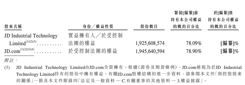 在上市前,京東集團是京東工業的絕對控股股東,通過多層架構控制著約 78.9%的股份。