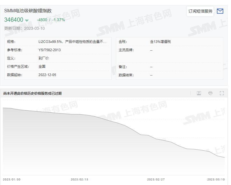 1、SMM電池級碳酸鋰指數報346400元每噸,下跌4800元每噸,跌幅為1.37%