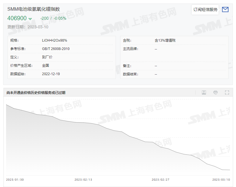 2、SMM電池級氫氧化鋰鋰指數報406900元每噸,下跌200元每噸,跌幅為0.05%