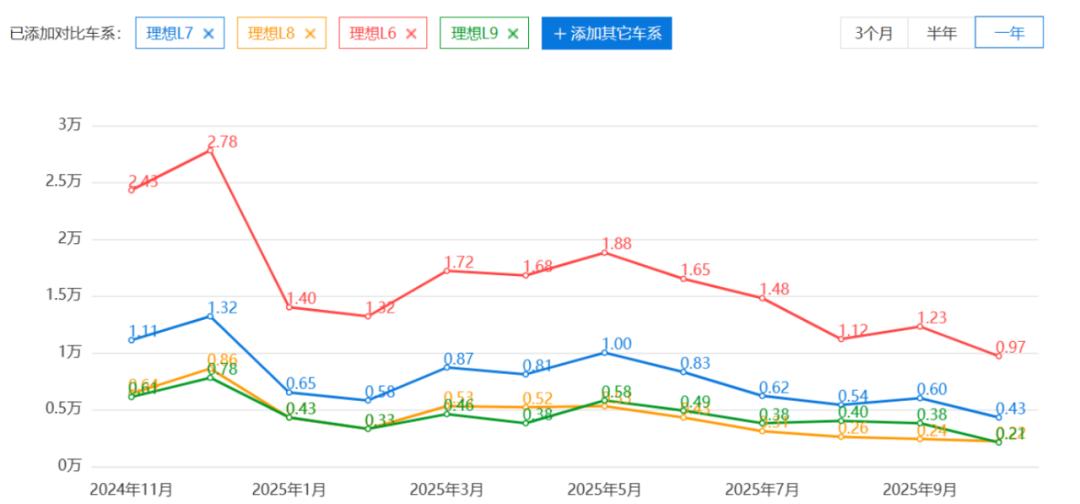 但賺錢的前提是車要賣得出去。今年以來,理想L系列的銷量持續走低,來到10月,銷量主力理想L6的交付已不到1萬,較高峰期近乎腰斬。