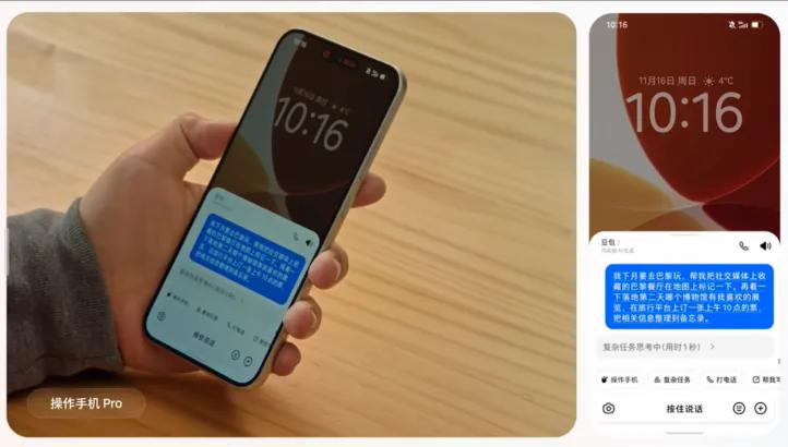 在演示視頻里,用戶只需開口下令,手機便能自動調用不同APP,完成比價、訂餐、規劃行程等一連串復雜操作,與當初IPhone16提到的AI手機概念有異曲同工之妙,甚至更強大。